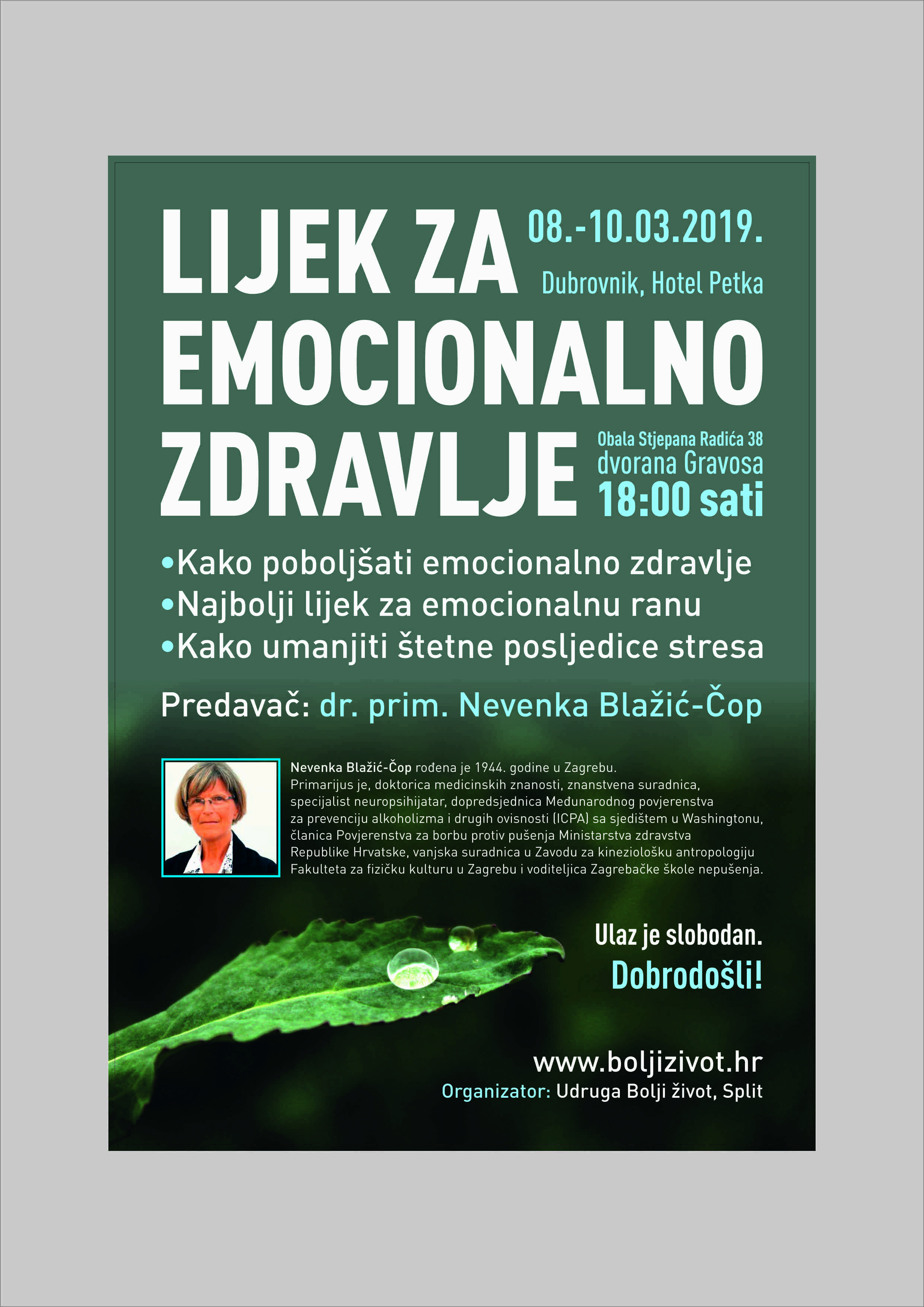 Ovdje možete pogledati dva predavanja o emocionalnom zdravlju, održanima u Dubrovniku od 8-10.03.2019. godine. Predavač je prim. dr. sc. Nevenka Čop.